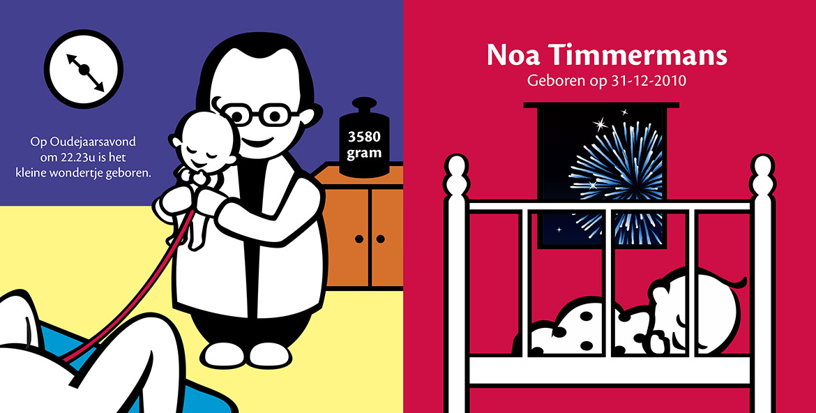 Voor de geboorte van mijn eerste dochter Noa wilde ik iets heel speciaals maken als geboortekaartje. Ik had het altijd al leuk gevonden om verhalen te schrijven en toen mijn partner voorstelde om een prentenboekje te maken, was de keuze snel gemaakt. Het eindresultaat is een kleurrijk boekje met allerlei grappige illustraties en teksten. Het verhaal gaat over de hoogtepunten van negen maanden zwangerschap.